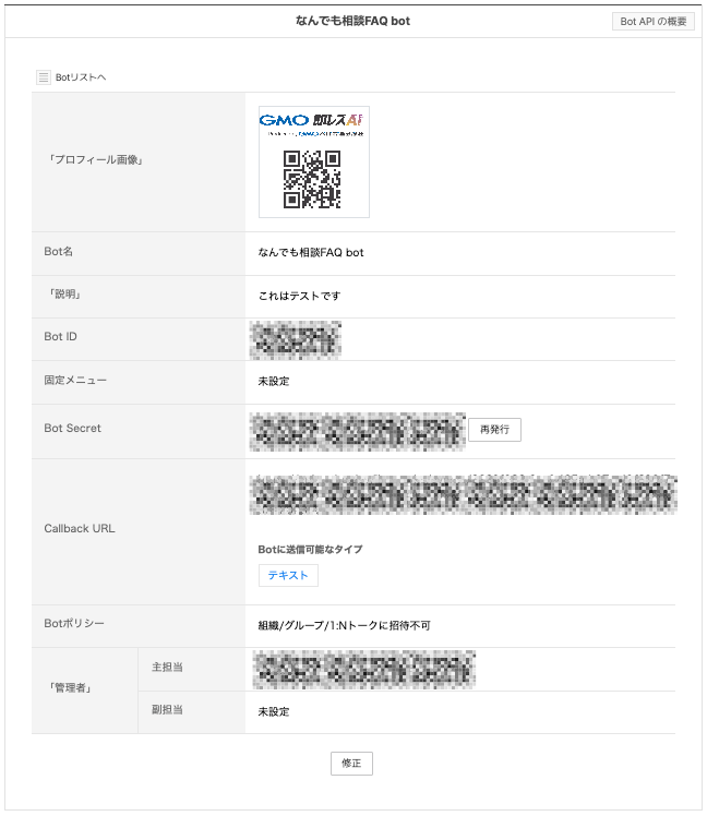 保存後、Bot ID と Bot Secret が発行されます。