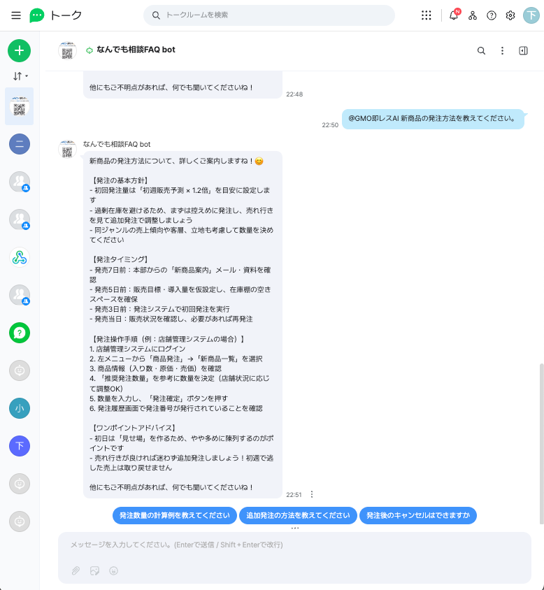 ただし、「同一チャンネルであれば異なるユーザーの発話も同一履歴とみなす」をONにすると、複数人トークルーム内で共有の履歴を使って応答が行われます。この設定を有効にすることで、グループでBotに質問し、共通の文脈で回答を得ることができます。