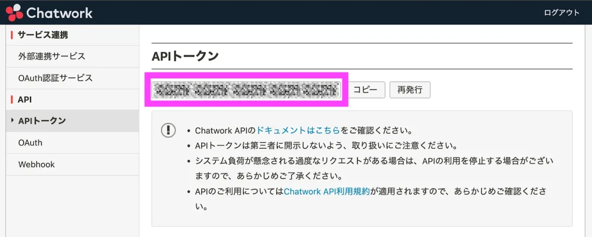 Chatwork APIトークン(Chatworkの管理画面から取得)