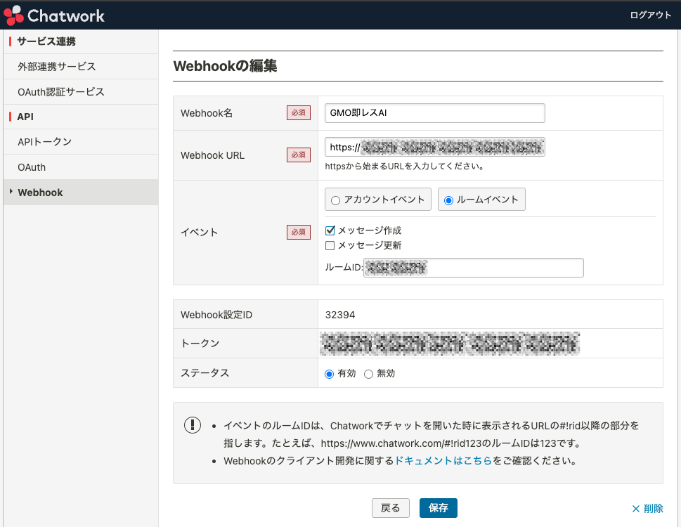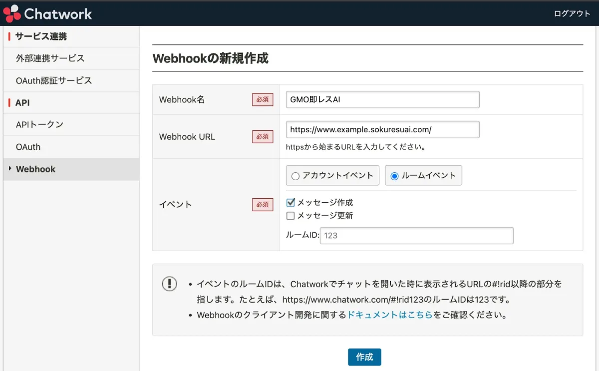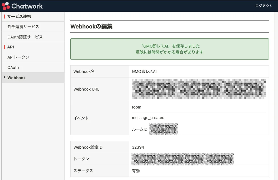 以上の操作でChatworkとGMO即レスAIの連携は完了です。