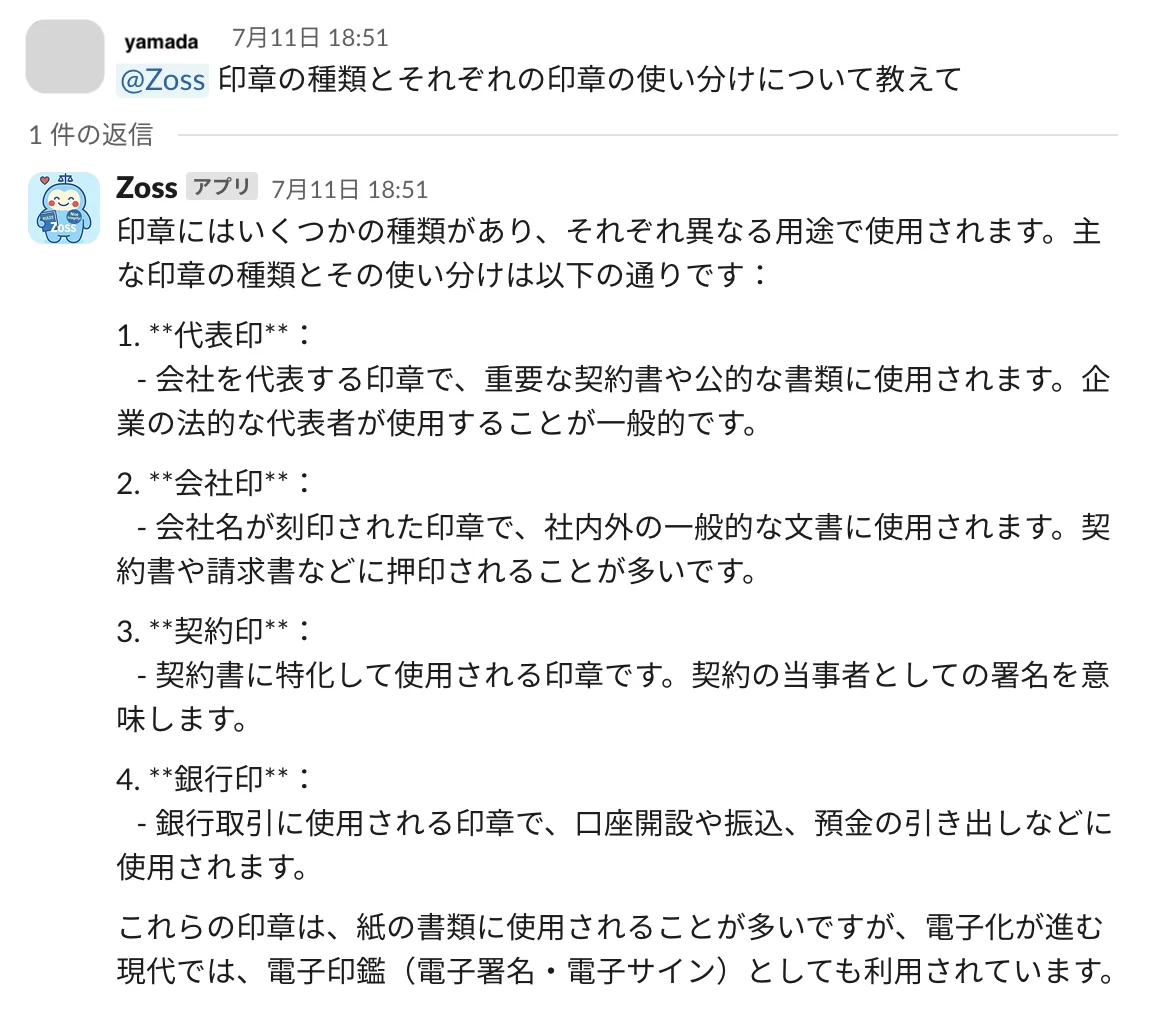 zossによる回答の精度は約70〜74%でまだまだ改善の余地がありつつも、導入後は法務メンバーの業務負担が半減。とくに定型的な問い合わせが多いキャンペーン審査や捺印申請において、AIによる回答が大きな効果を発揮しています。