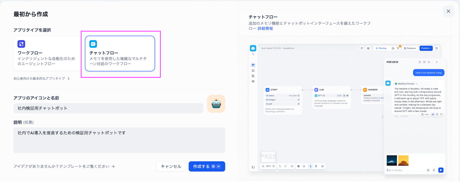 「最初から作成」から「チャットフロー」を選択し「作成する」を選ぶ
