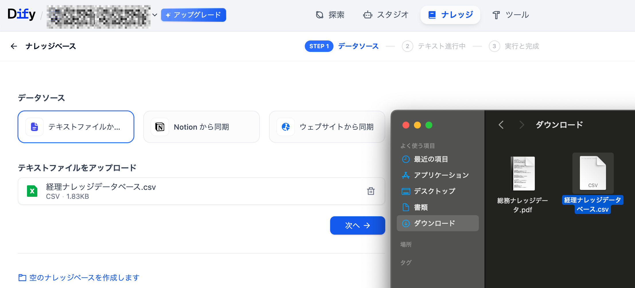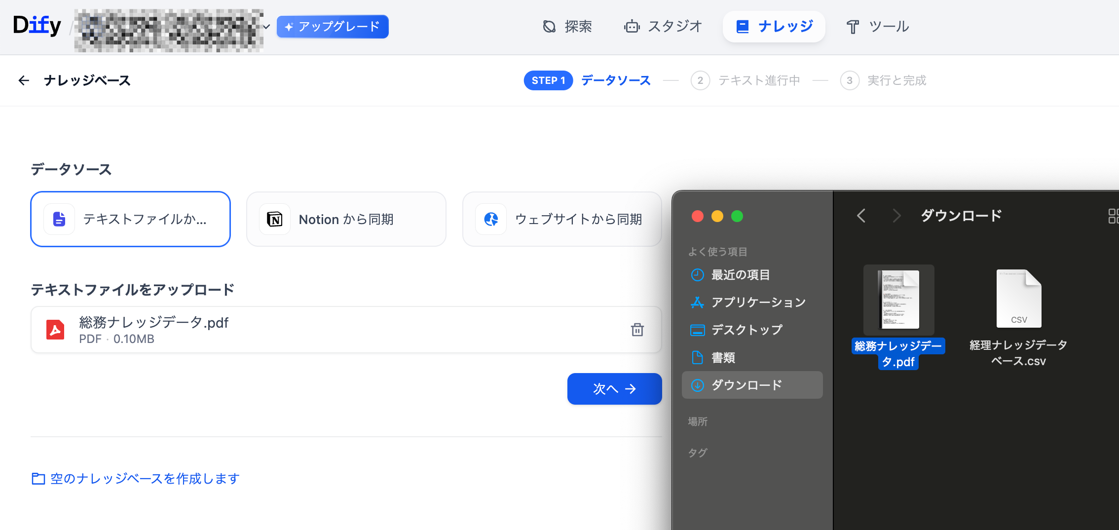 「ナレッジ」を選択し「ナレッジベースを作成」をクリックし、用意したナレッジファイルを選択します。