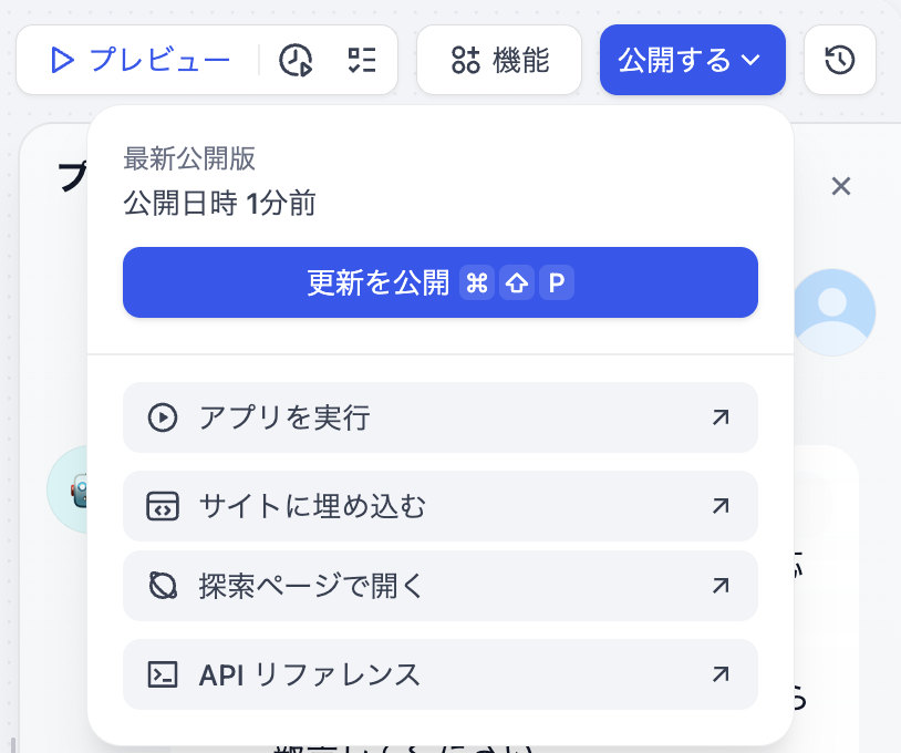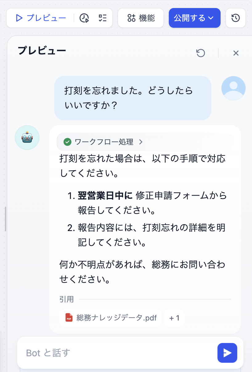 作成したチャットボットが狙い通りに回答を返してくれるか、プレビューして確認することもできます。