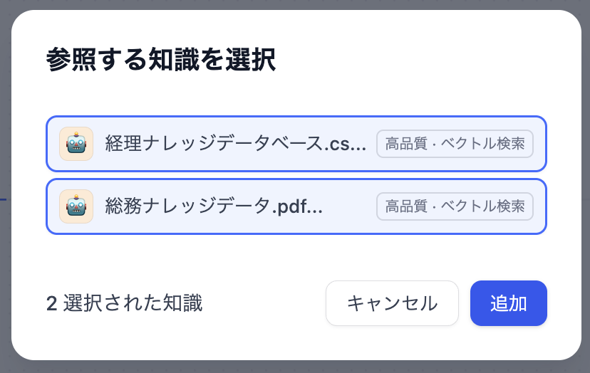 ナレッジベースの+から先ほど用意したcsv、PDFファイルを格納したナレッジを選択します。