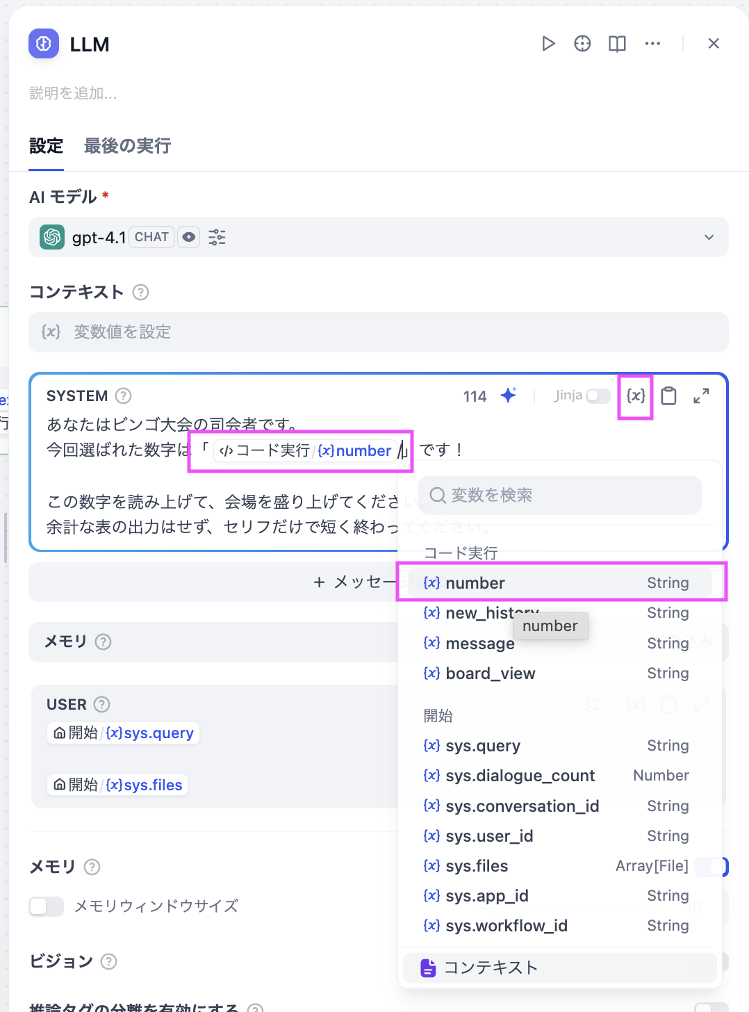 「LLM」ブロックを追加し、SYSTEMプロンプトに指示します。
