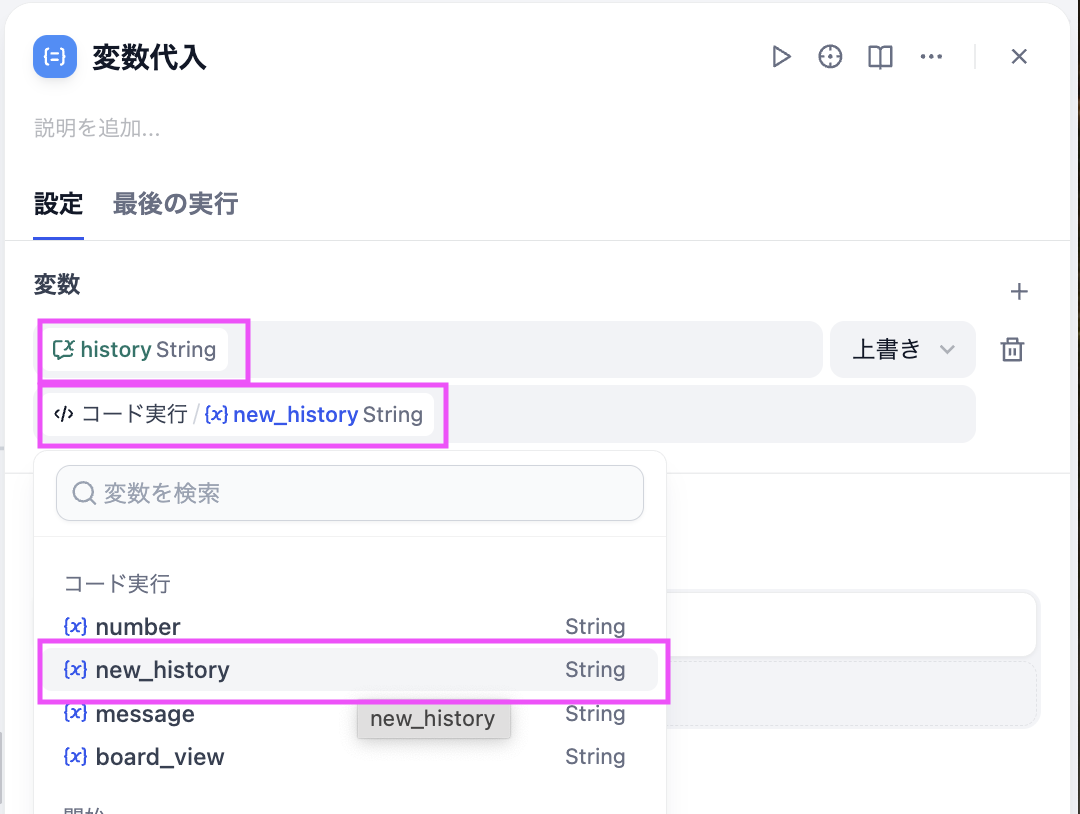 「変数代入」ノードをつなぎ、変数に「history」を設定し、コードが出力した new_history を代入する設定を行います。
