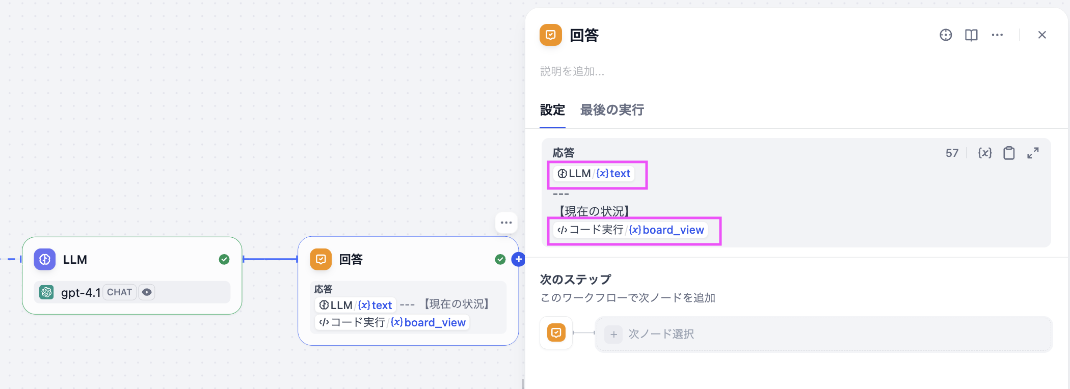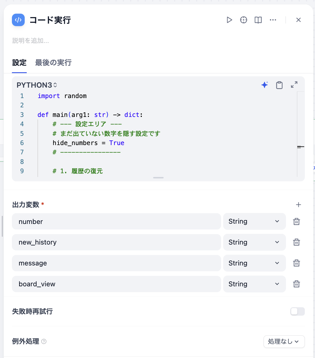 貼り付けたら、下部の「出力変数」に number, new_history, message, board_view の4つ(すべてString型)を定義します。