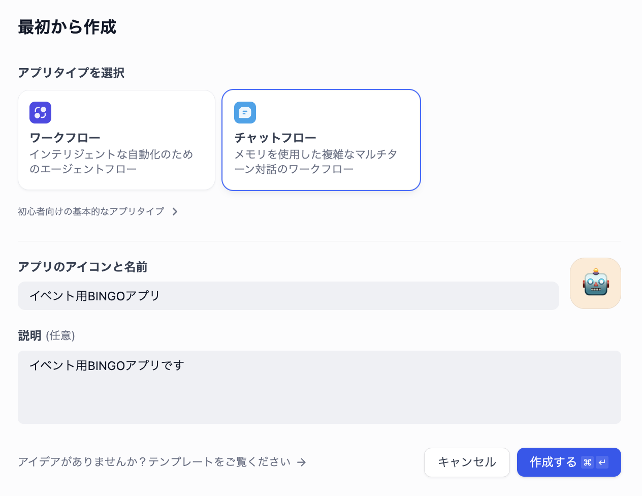 Difyにログインし、最初から作成 → チャットフローを選びます。