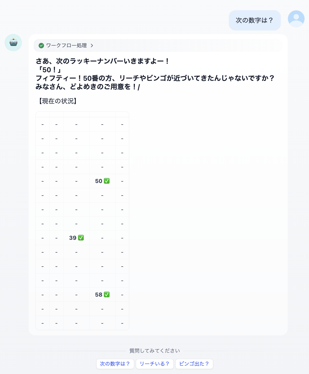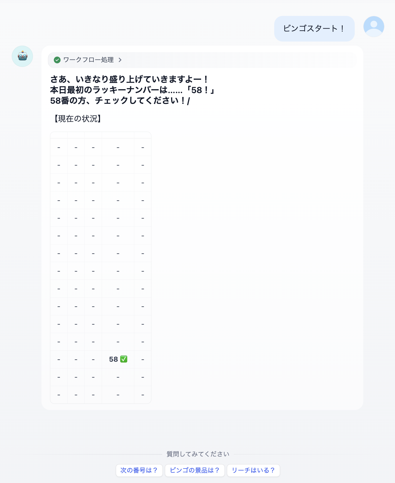 単純に生成AIへビンゴゲームの司会を依頼して、スレッドで続けるように数字を出力させることも可能ですが、重複した数字や順番通りの数字を出力してしまって、うまく司会進行できないことがあります。