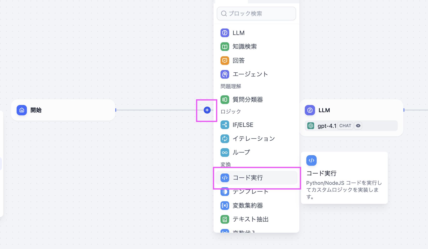 開始ブロックとLLMブロックの間で「+」を押して、コード実行を選択します。