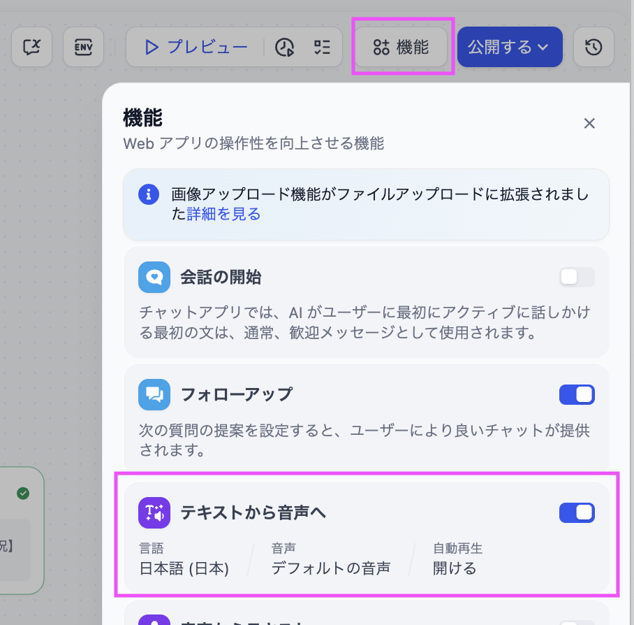 設定の「機能」から「テキスト読み上げ」を有効にし、「自動再生」をONにします。