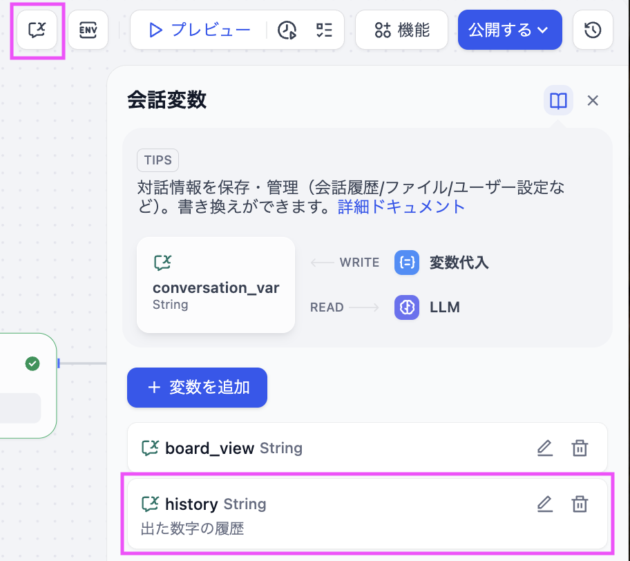 画像のような吹き出しマークから会話変数の編集画面を開き、変数を1つ追加します。