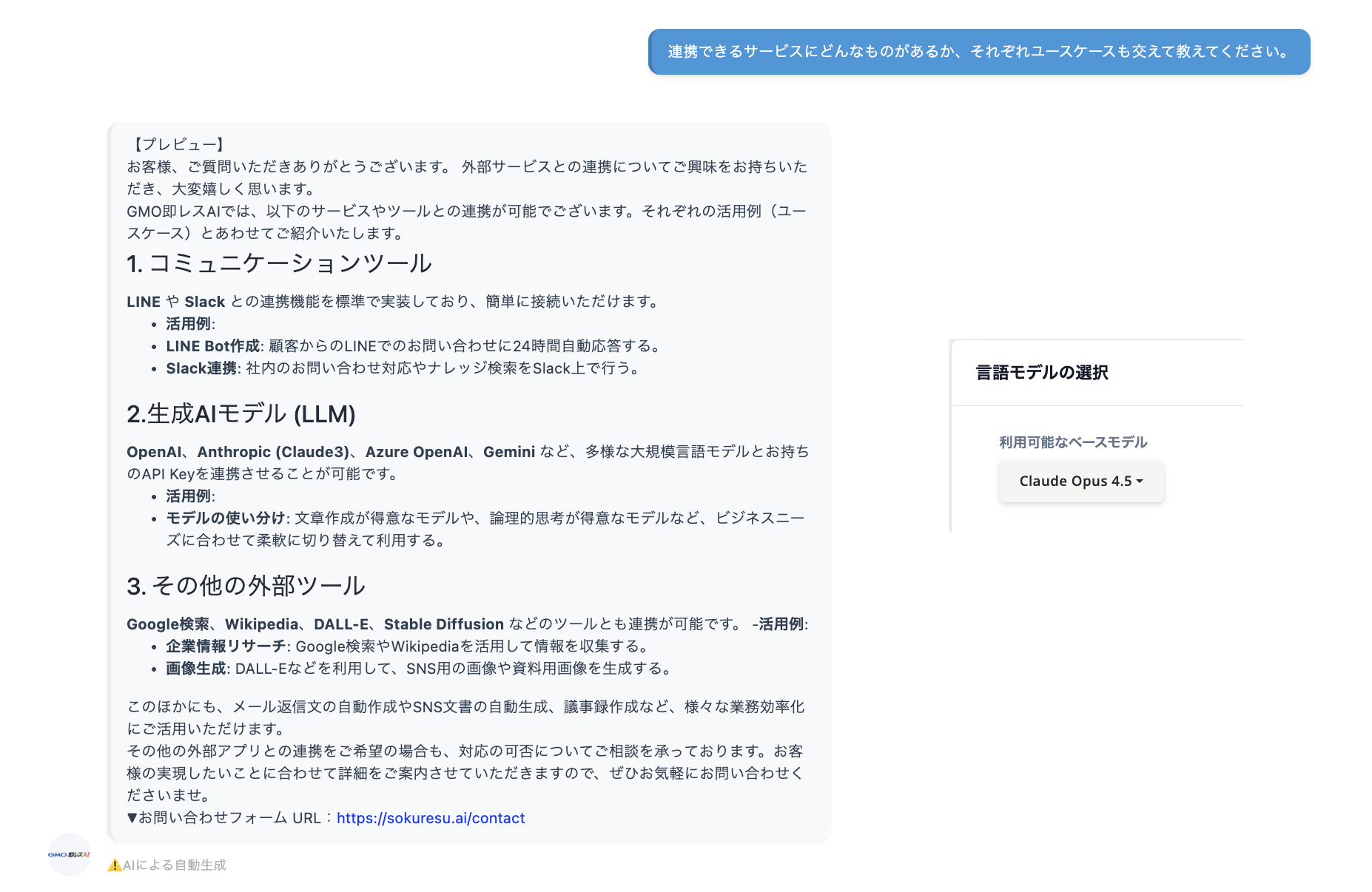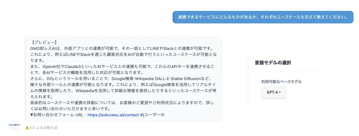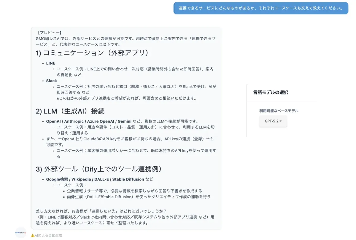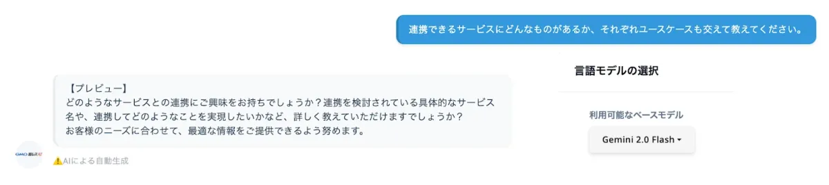 今回の検証では、「連携できるサービスとユースケースを教えてほしい」というまったく同じ質問を投げかけ、異なる言語モデルの世代でどのような違いが生まれるかを比較しました。
