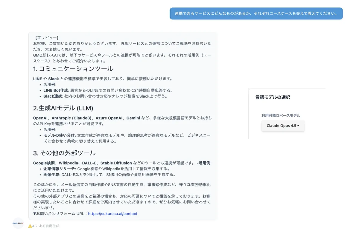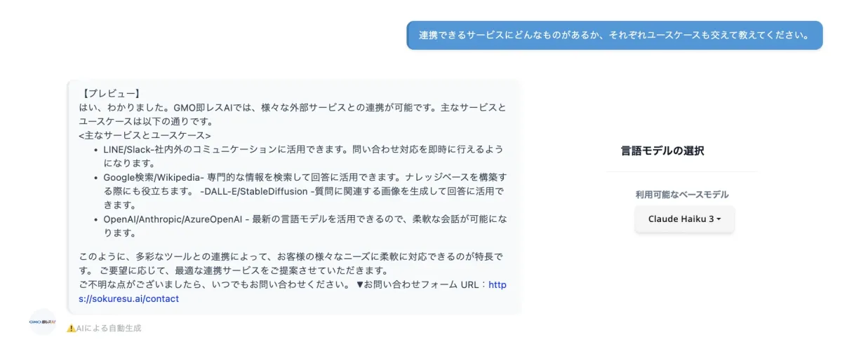 質問者が連携できるサービスを聞いている意図を汲み取り、具体的なサービス名(LINE、Slack)とその利用シーンを先回りして提示しました。生成AIブランドAPIとの連携ができることに加えて外部連携についてのユースケースにも多数触れています。