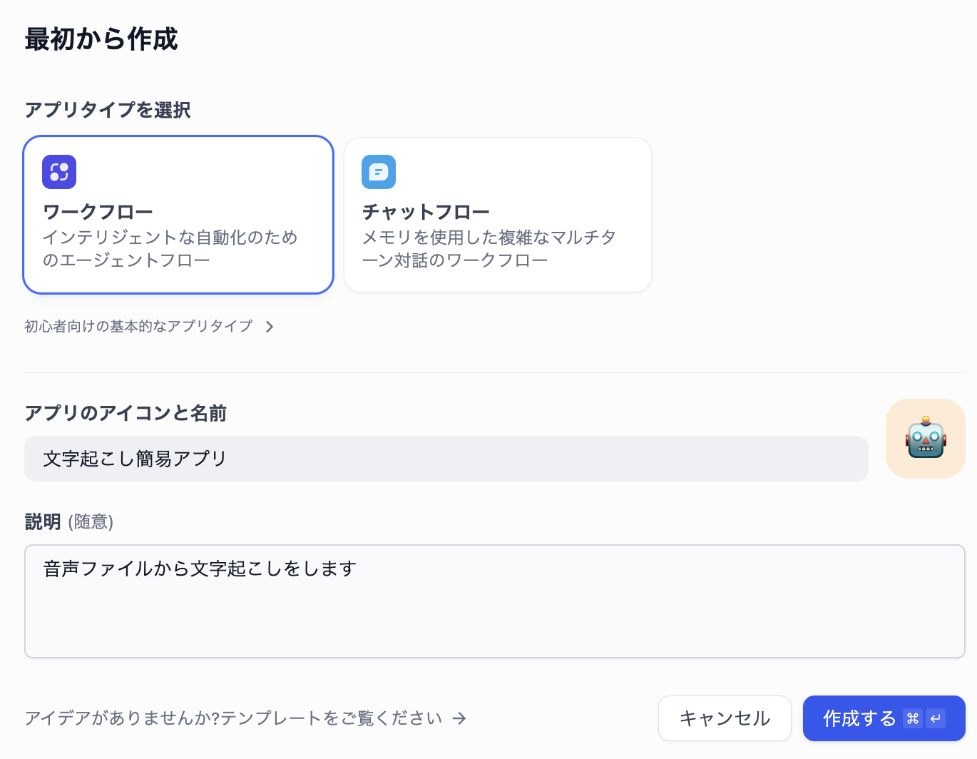 Difyのスタジオで「最初から作成」をクリックし、アプリタイプでワークフローを選択します。アプリの名前と説明はわかりやすく、「文字起こし簡易アプリ」と入力します。