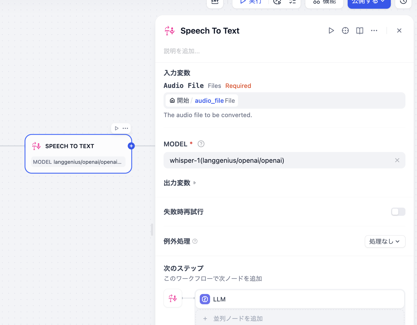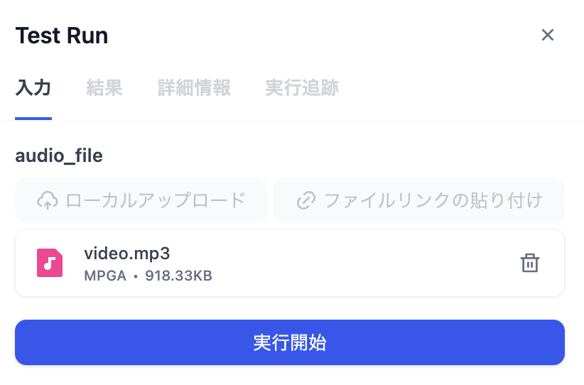 音声ファイルをアップロードし実行開始します。うまく出力されない場合、LLMのコンテキストの設定や変数が正しく設定されているか確認します。