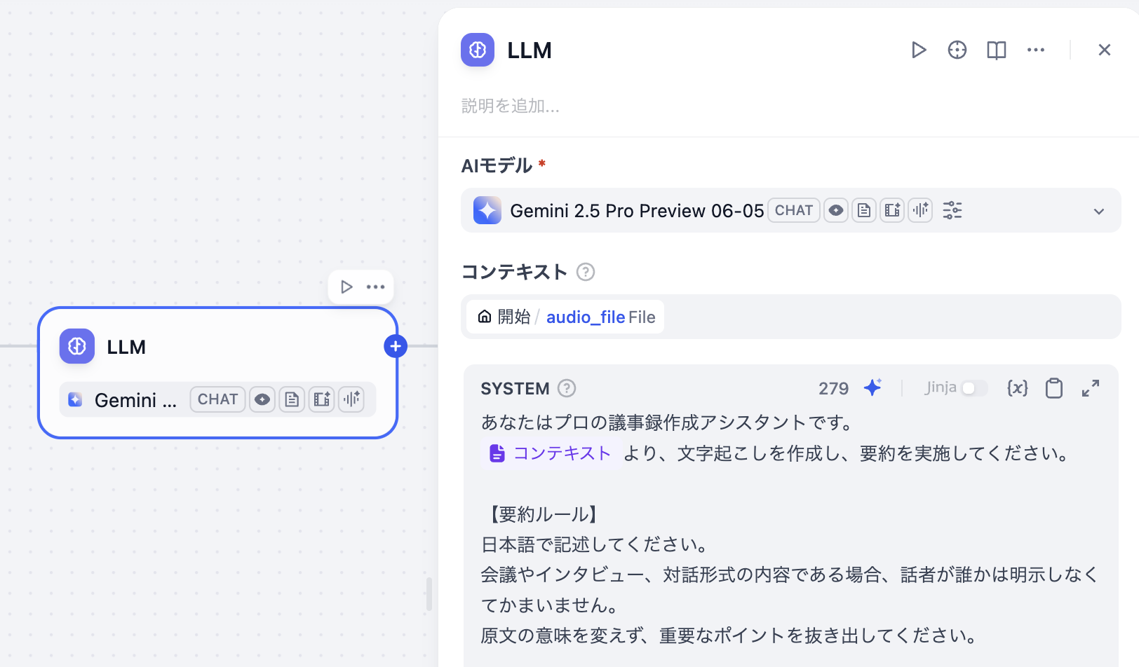 コンテキストに開始ノードで設定したaudio_fileを設定し、システムプロンプトにコンテキストを含む文字起こしと要約の指示文を記載します。ビジョンでaudio_fileを指定します。