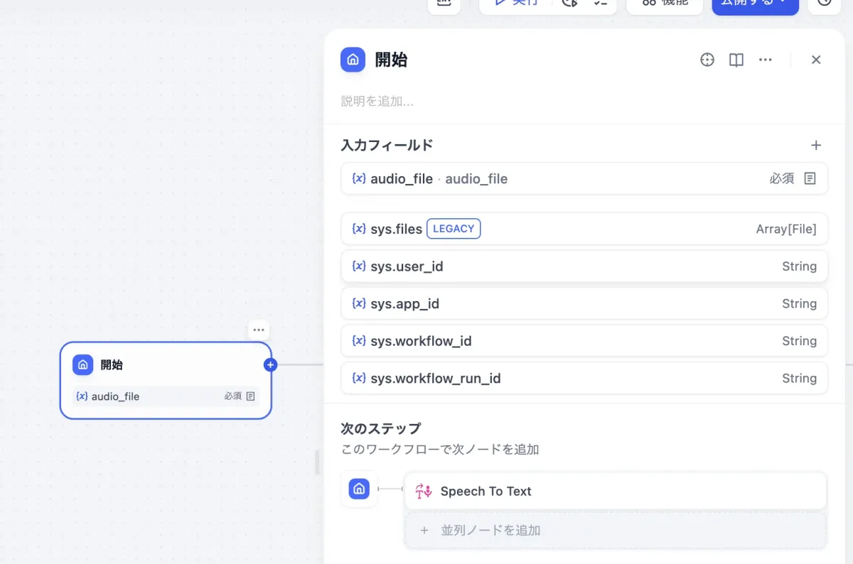 今回、音声ファイルから文字を起こしたいので、ファイルのアップロードを開始ノードに設定します。