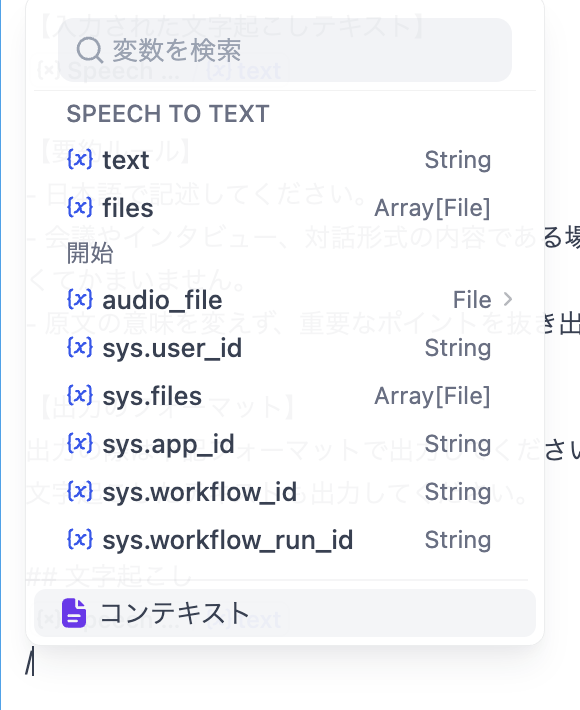 コンテキスト設定した際は、システムプロンプトに変数を追加します。変数は、Speach To Text/text を加えます。/ を入力すると変数が選択できます。