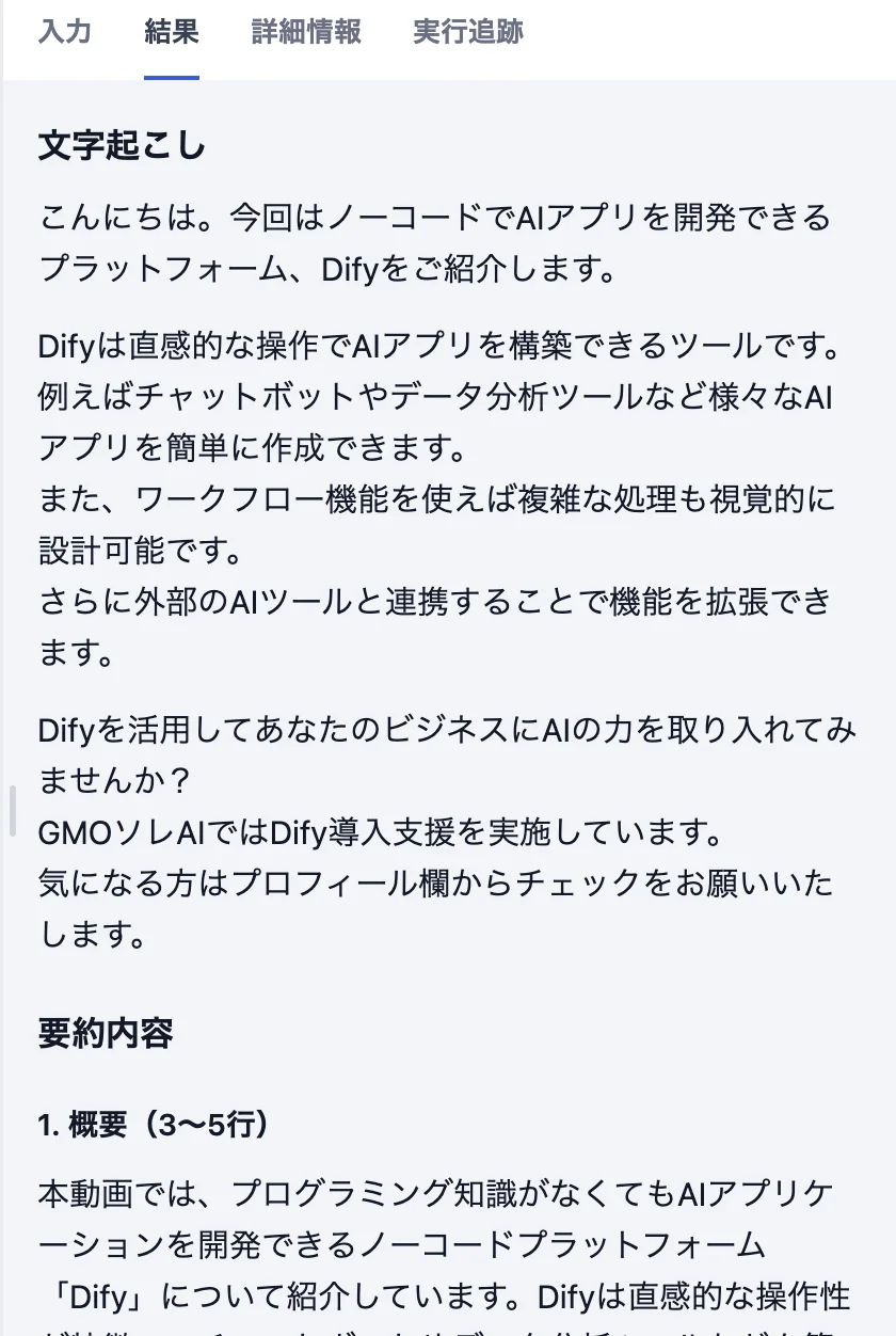 文字起こし文と要約文が生成できました。今回は、LLMのシステムプロンプトで、文字起こしのテキストと要約データを出力する指示を設定したので、しっかり要約文まで生成されました。